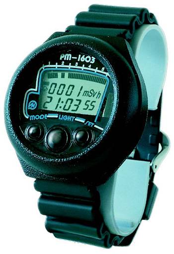Дозиметр гамма-излучения наручный ДКГ-РМ1603В предназначен для непрерывного измерения мощности амбиентной эквивалентной дозы рентгеновского и гамма-излучения; измерения амбиентной эквивалентной дозы рентгеновского и гамма-излучения; измерения времени набора амбиентной эквивалентной дозы рентгеновского и гамма-излучения; передачи информации, накопленной и сохраненной в энергонезависимой памяти, по ифракрасному каналу связи в персональный компьютер; индикации времени в часах, минутах и секундах, днях недели, индикации числа и месяца, а также использования в качестве будильника, таймера, секундомера.