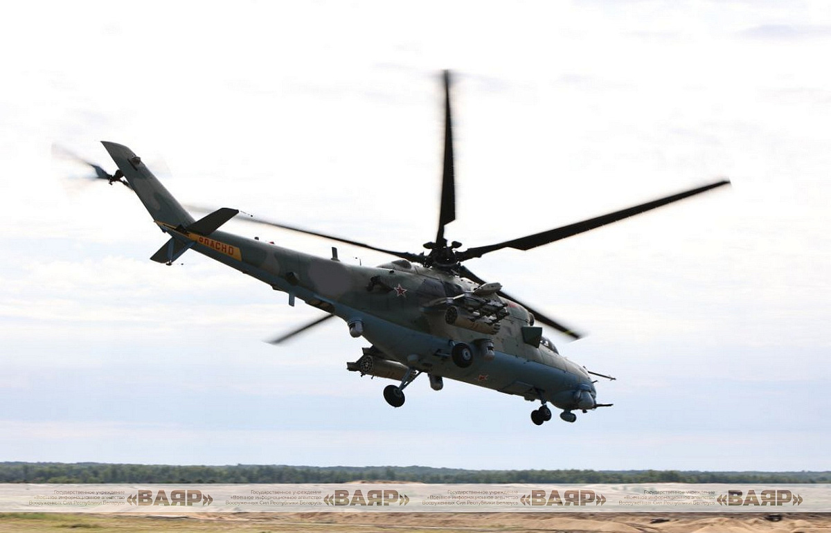Пара вертолетов Ми-35 выполнила тактический прием «Горка» по обнаружению условного противника и нанесла по нему удар неуправляемыми ракетами.