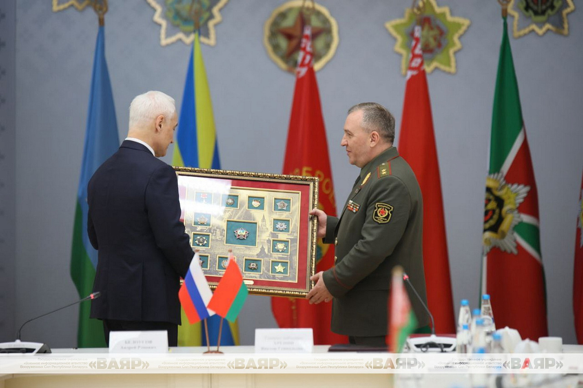 Андрей Белоусов привез в подарок главе оборонного ведомства Беларуси генерал-лейтенанту Виктору Хренину подарок — архивные материалы, отражающие вехи славного боевого пути дедов Виктора Геннадьевича, участвовавших в Великой Отечественной войне.