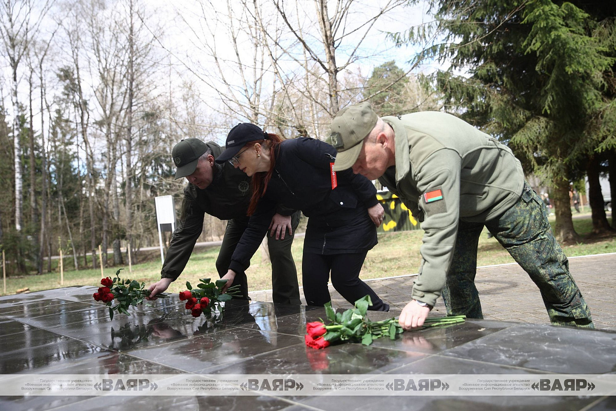 Министр обороны генерал-лейтенант Виктор Хренин и участники субботника возложили цветы к монументу и почтили память партизан, а также героев и жертв Великой Отечественной войны.